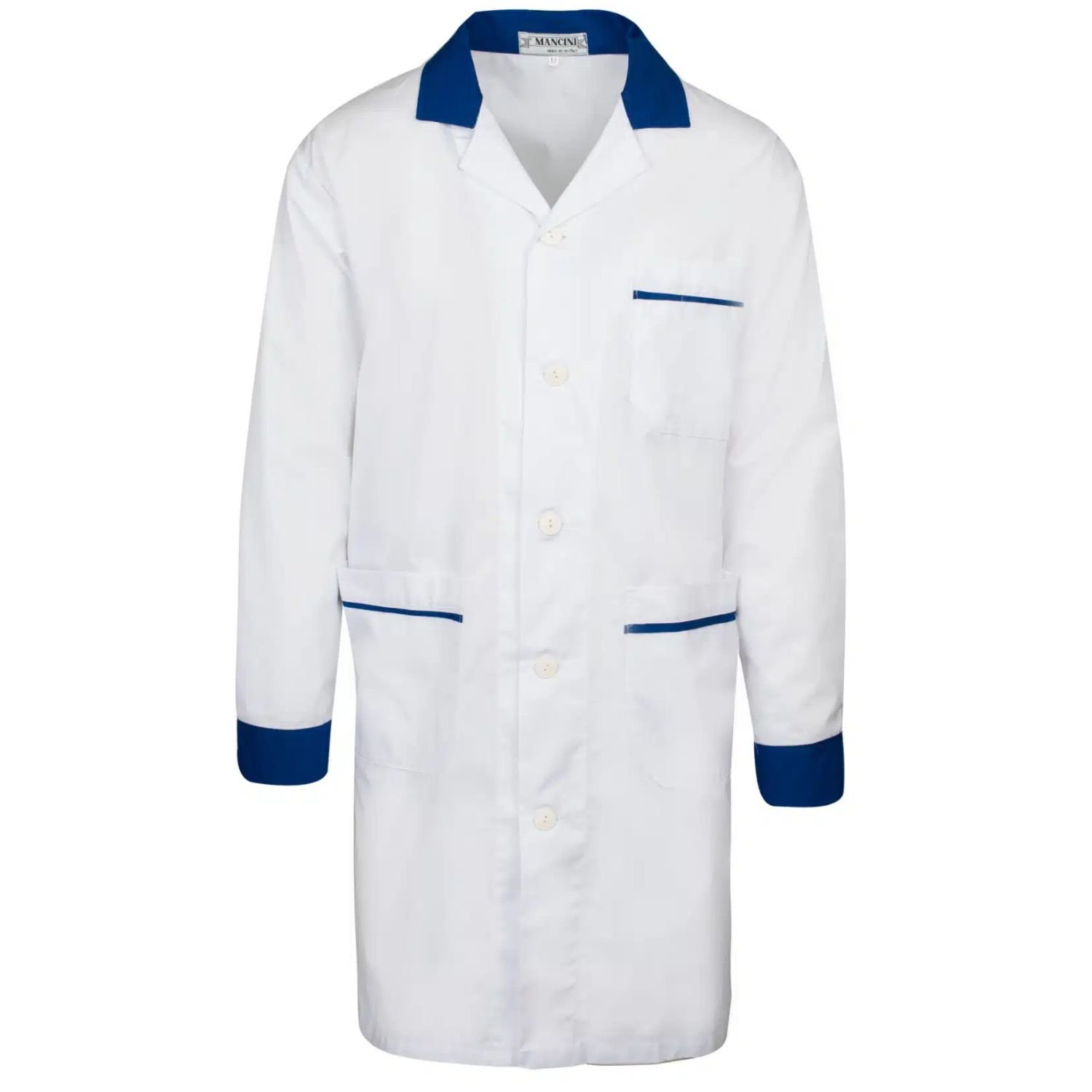 - Ρόμπα κρεοπώλη λευκή με μπλε σιρίτια στις τσέπες, τον γιακά και τις μανσέτες.